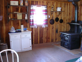 This 1880’s log cabin can sleep up to five people, it has a double bed and a twin bed in the sleeping alcove, couch and a fold out bed by the wood stove in the living room, kitchen with antique stove, and sun room with armchairs.
